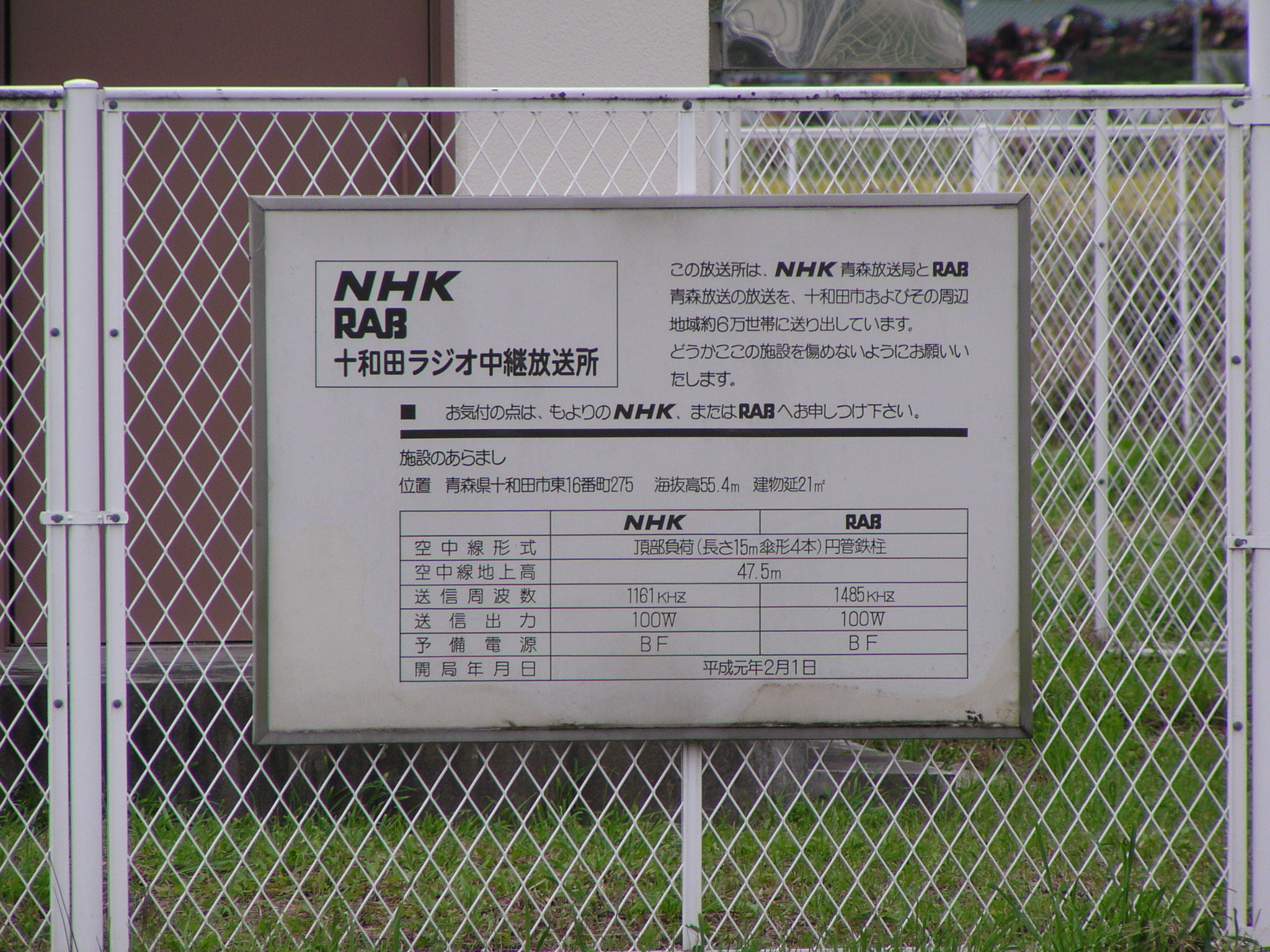 RAB 青森放送 NHK青森放送局 ■十和田ラジオ送信所 RAB/1485KHz/100w NHK/1161KHz/100w 青森県十和田市東16番町275 地図: 1/25000:電波塔表示有 | |