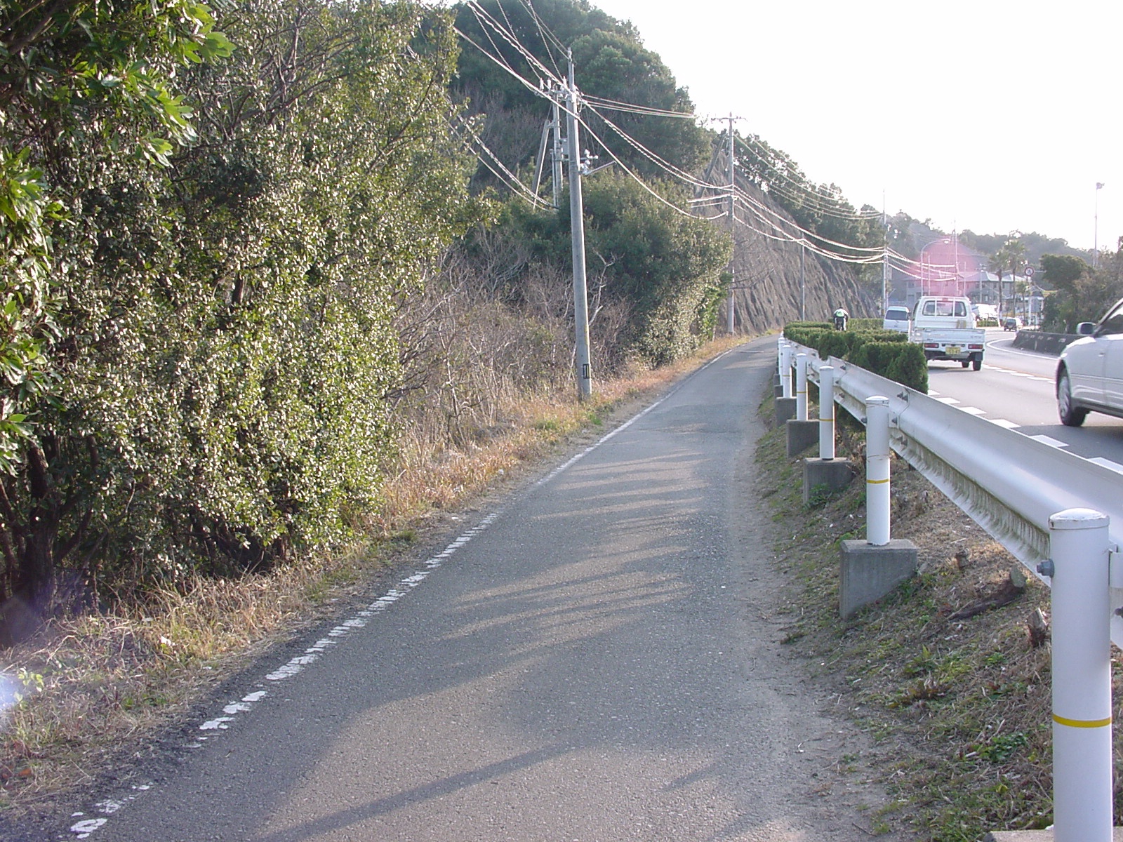 送信所真横の道路、本線とガードレールで